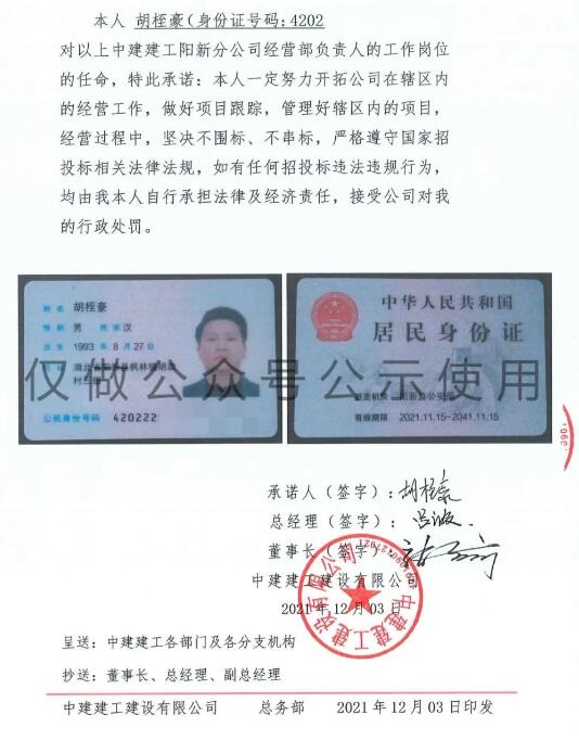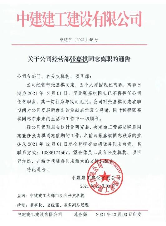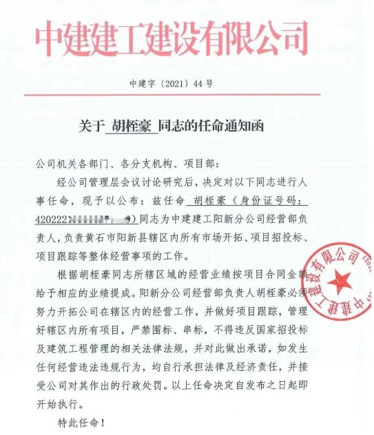 中建建工人事任命及變動通知函